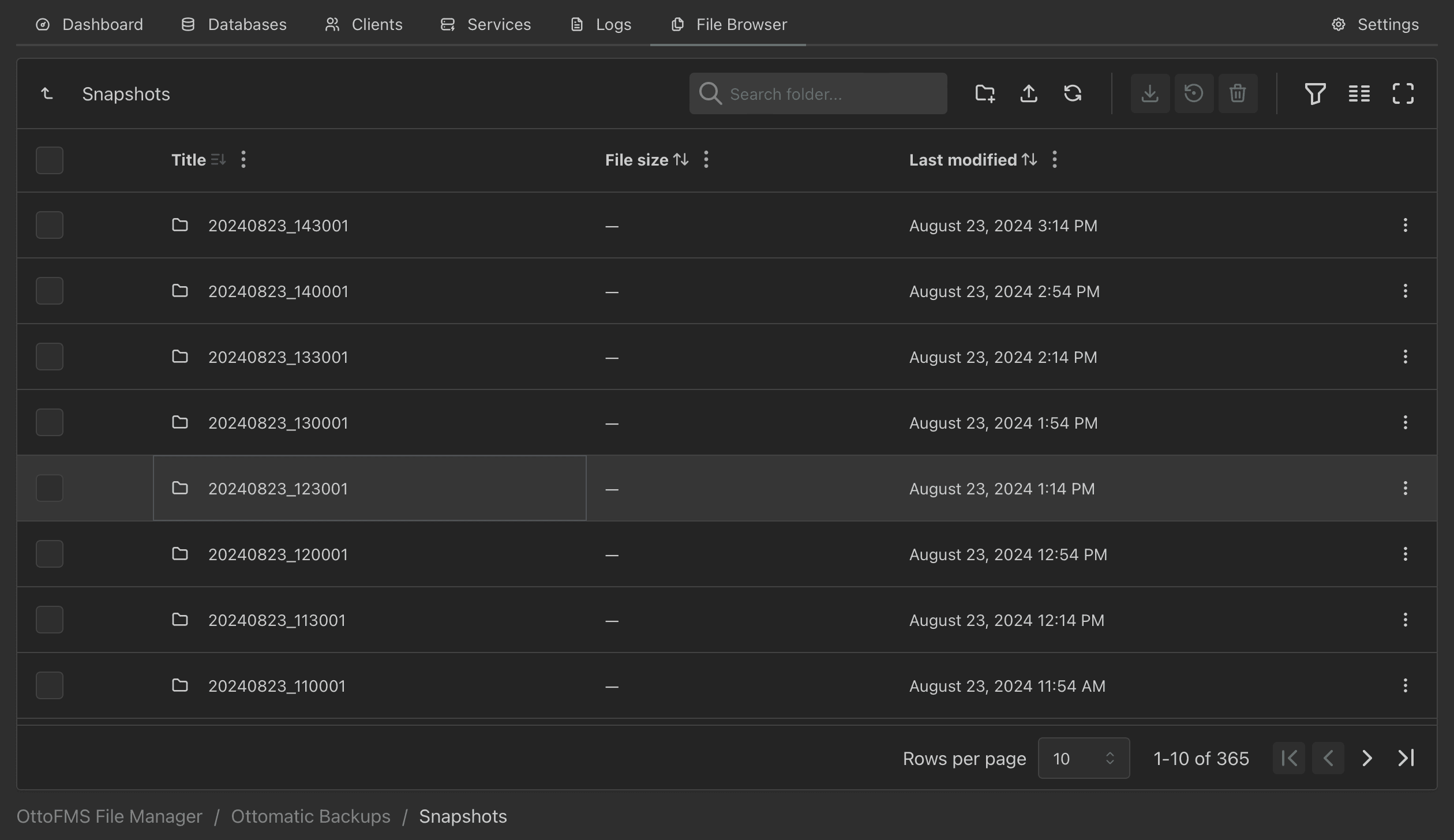 Local FileMaker Backups and Point-in-time snapshots (Snaps) can be downloaded or restored from the Ottomatic Cloud Console or OttoFMS whenever necessary.