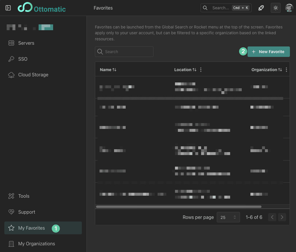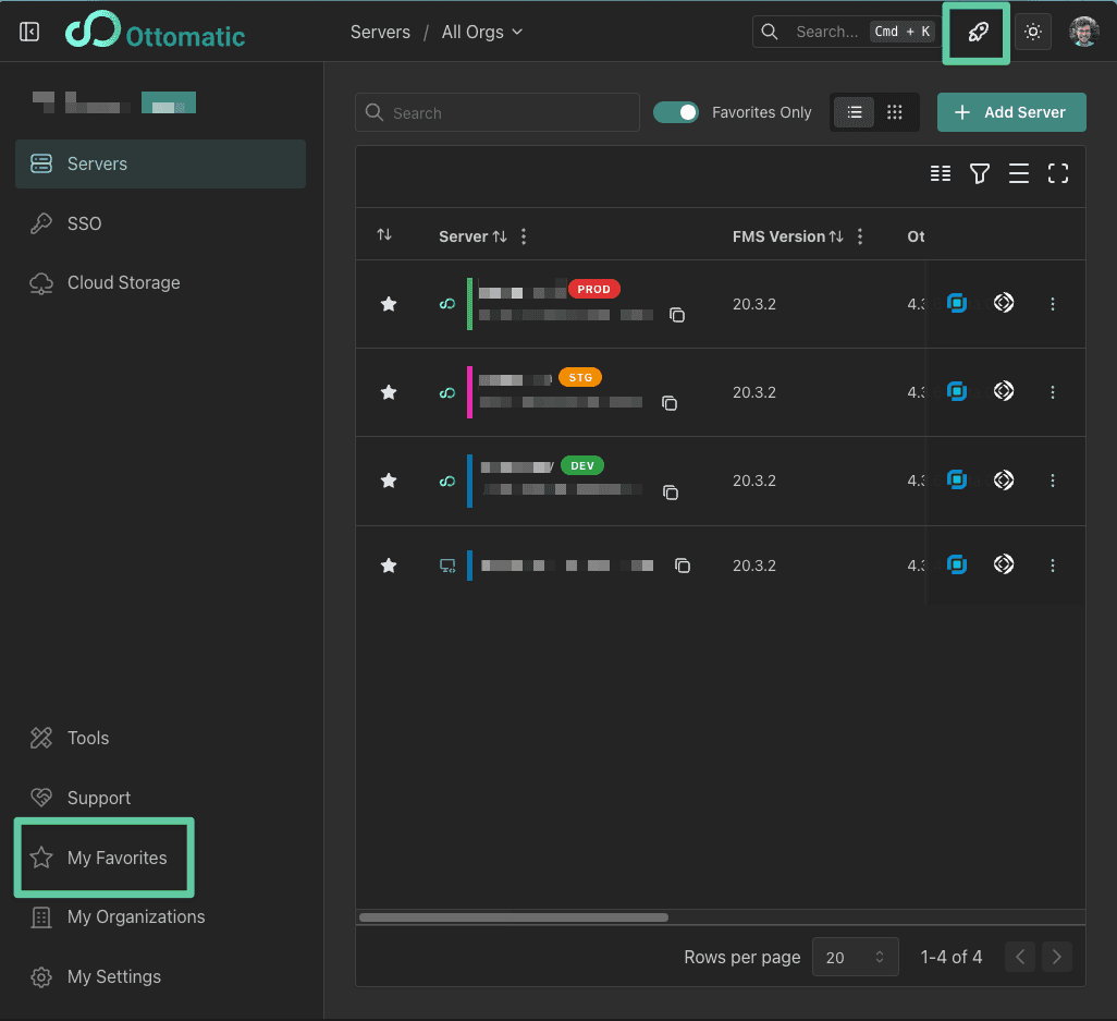 Favorites can be used to save servers, files, and urls for easy access. You can access your favorites from the Launcher in the top right or from the "My Favorites" tab in the Ottomatic Cloud Console.