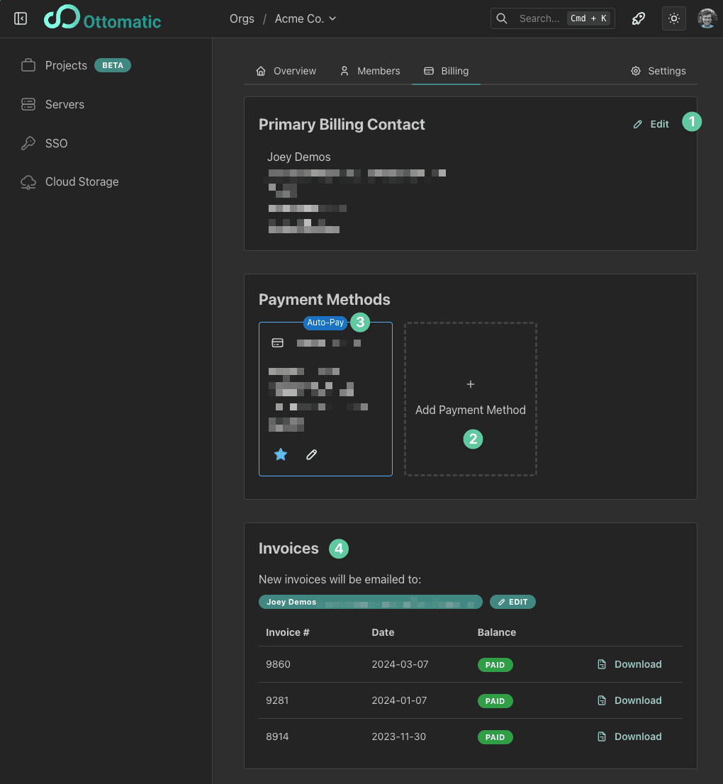 To make a payment, view invoices, or update your billing information, visit the Billing page in your organization dashboard.