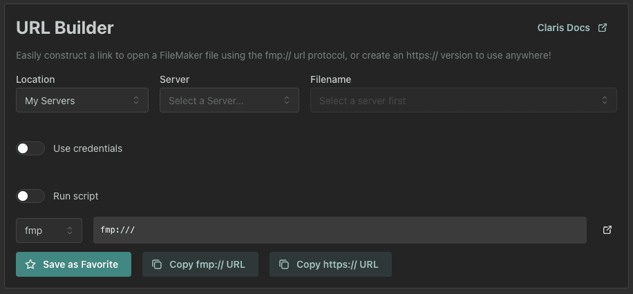The URL Builder tool lets you build urls to specific FileMaker files with embedded credentials or with scripts to run on opening the file. This can be useful for creating links to files that you want to share with others or to create links to set off processes in the file. Credentials are plain text and stored in the url, so be careful when sharing these links.