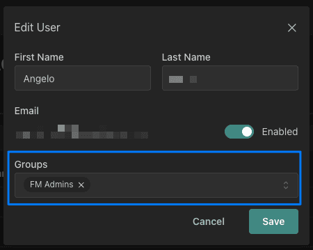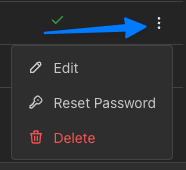 The Edit button in the user menu lets you change the user's name, manage their assigned groups, and enable or disable their account. This menu can also be accessed by clicking on the user's row in the table.