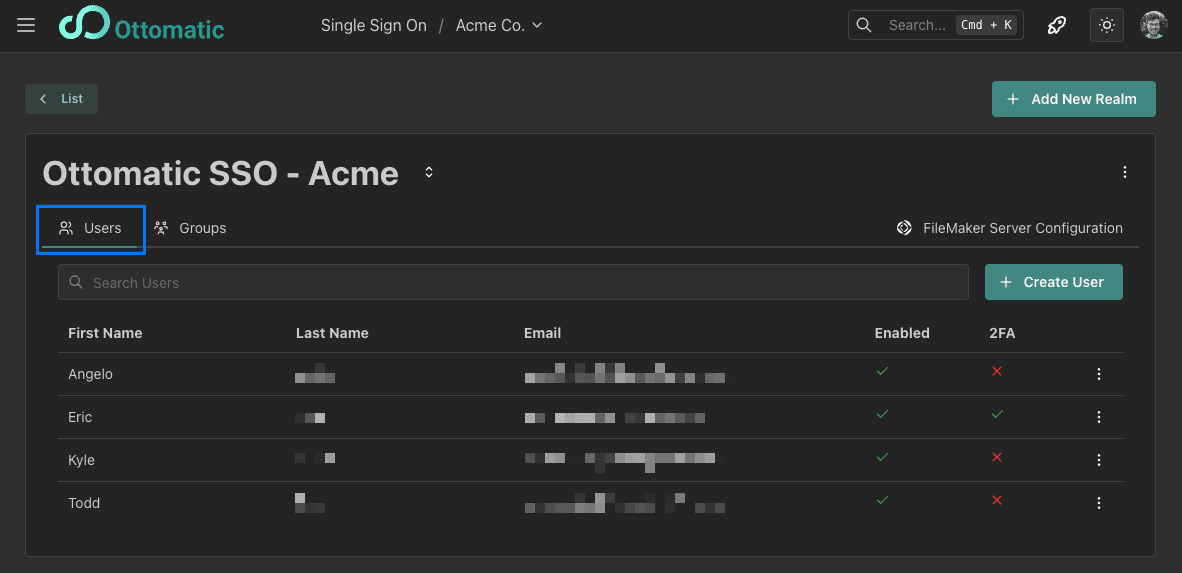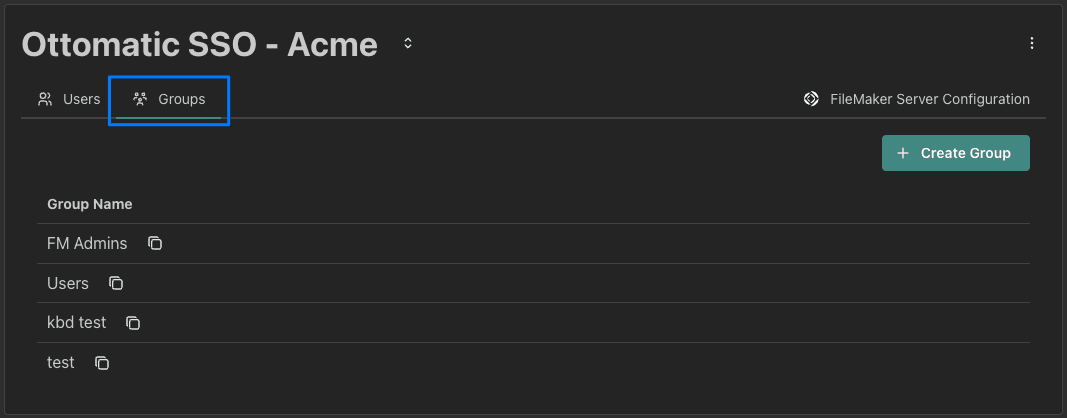 Each SSO group corresponds to an External Auth Group in your FileMaker application. The group name in the Cloud Console must correspond to the group name in FileMaker. To make setup simple, you can copy the group name right from the Groups tab of your SSO realm.