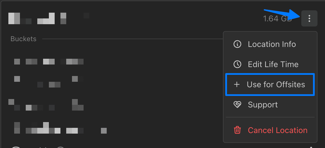 Ottomatic Object Storage is the ideal option for OttoFMS Offsite backups due to its ease of set up and life time options. From the Ottomatic Cloud Console, you can simply choose the option on your Storage Location to "Use for Offsites", which will give you an option to select a server to add the offsite location to.