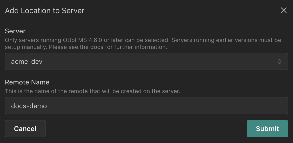 Select a server, add a location identifier, and click "Submit" to finish setup!